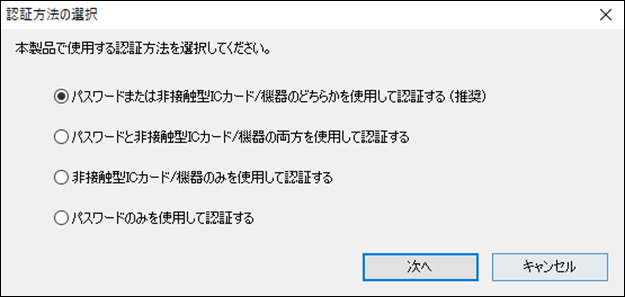 また、認証には通常のパスワード並びに非接触型のICカードを利用することができます。運用はICカードのみ、パスワードのみ、または両方使用しなければ認証出来ないなど、ユーザーの使用環境によって多彩な設定が可能です。