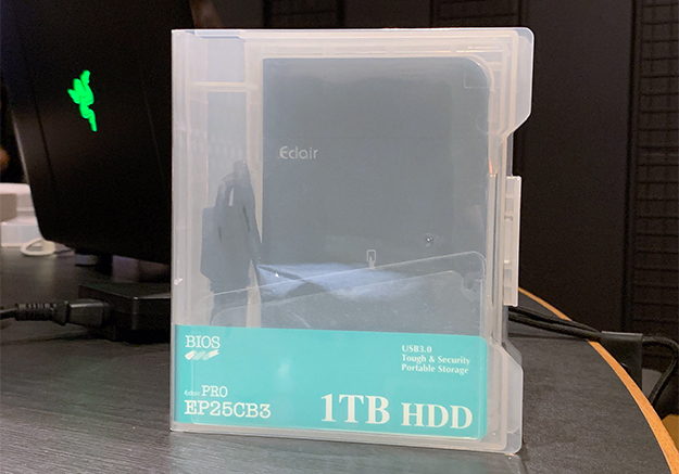 今回ご紹介するバイオス社のEclairPRO EP25CB3シリーズですが、SSD全盛の現在にあえてHDDを投入するという意欲的な製品です。製品はUSB3.0接続、Mac/Windows両対応のポータブルHDDとなっており、現在1TBモデルと2TBのモデルがリリースされています。ではその外観の特徴から見ていきましょう。