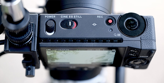 ボディ前面にはレンズの着脱ボタンのみ、上部にはパワースイッチとムービーのRECスイッチ、スチールのシャッター。そしてフロントからも操作できるダイヤルとちょっと大きめのSTILLとCINEの切り替えスイッチが配置されている。このことからもSTILLとCINEの比重が半々ということを感じ取ることができる。