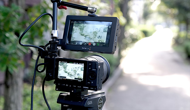 さて、今回はボディに45mm f2.8を付け、一番軽装で街中のスナップムービー撮影というスタイルと、シネレンズにビューファインダー、5インチ外部液晶、外付けSSDを身近にあるもので組んでフルスペックのスタイル、という両極端な方向で試してみた。後者のセッティングには付属の「HU-11」というホットシューユニットが大活躍してくれた。今回はテストということで自前のsachtler Aceでどうにかなったが、実際の撮影で使うにはスライドベースにビデオ18クラス以上は欲しいところである。