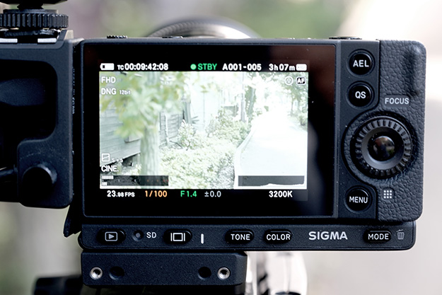 裏面には前述の通り固定式の3.15インチ液晶モニターがありAELボタン、QS(クイックセット)ボタン、多機能ダイヤル、そのセンターに、OKボタン、そしてMENUと縦に並び、液晶下部に、再生、ディスプレイ、TONE、COLOR、MODEと5つのボタンが並ぶ。この少ない操作ボタンのなかにTONEとCOLORの2つを割り当ててることにシグマのこだわりを感じるが、スケーラブルを謳うなら、それをファンクションボタンに割り当ててくれたら、ユーザーそれぞれがカスタマイズしやすくなるだろう(TONEとCOLORはQSで十分だと思っている)。