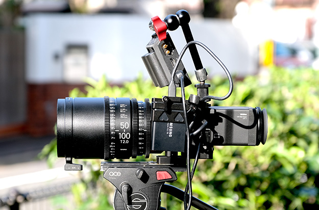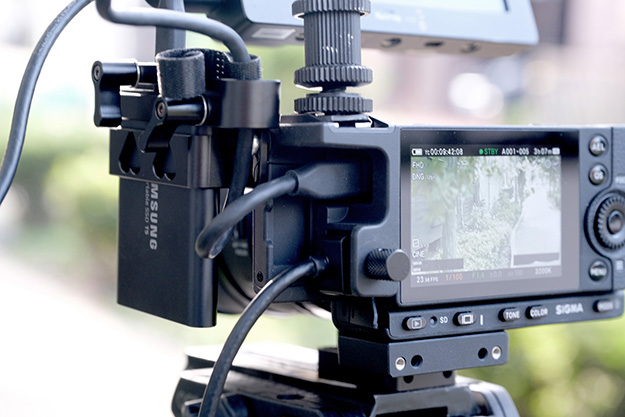 そして本命のフルセッティング。50-100mmT2.0のシネレンズを付けてSSD収録のfpである。このカメラの外観3Dデータはシグマから公開しているので、近日中にはサードパーティーによるリグなどの周辺機器も揃ってくると思われるが、今のところ頼みの綱はHU-11というホットシューユニットだ。かなりしっかりとした作りで、これが本体付属で付いてきてくれるのは嬉しい。