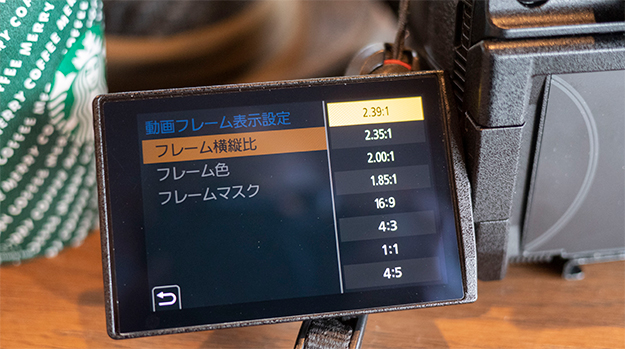 フレーム表示色の選択やフレーム外側の映像の透過度を選択できるフレームマスク機能も搭載している充実ぶり。確実なフレーミングをしたい場合は、レタボの透過度はハーフより完全に黒く潰して見るのも良いだろう。今回は10:3と特異な比率だったため、中でも上下幅が一番狭い2.39:1を選択し、フレーミングの目安にした。