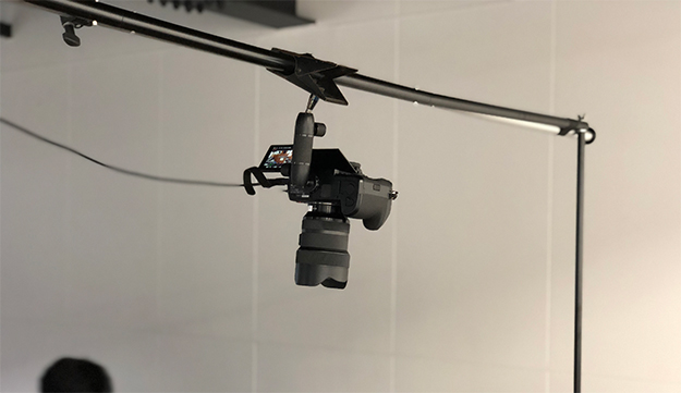 結果として、会議用テーブルをまたぐようにバックペーパー用のポールセットを設置し、ポールの真ん中に強力な撮影用クリップ雲台でS1Hを吊り下げた。こんな簡易的なセットでもミラーレス一眼であれば吊り下げる事は難しくない。一般的なシネマカメラから見れば、S1Hはほとんどウェアラブルカメラの域だ。天井が低く高さはそれほど確保できなかったため、広角レンズで撮影するしかなかったが、フルフレームであれば画角に余裕もあり、極端に広角にしなければ歪みもそれほど感じない。