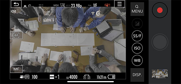 特筆すべきは、スマホに映し出される映像の綺麗さ。GH5の時は、若干モザイクっぽい汚い映像で、あくまで画角確認の域であったが、LUMIX Syncの場合、各種コントロールボタンと一緒に、かなり綺麗な映像が映る。さらに6K24pもしくは5.9K30p/24pでも録画中ブラックアウトしない。これにより録画中も遠隔で映像を確認でき、出演者にその場で詳細な指示を送ることが出来た(ただV-Log収録時はLUTは当たらず淡い色でのモニタリングになる)。