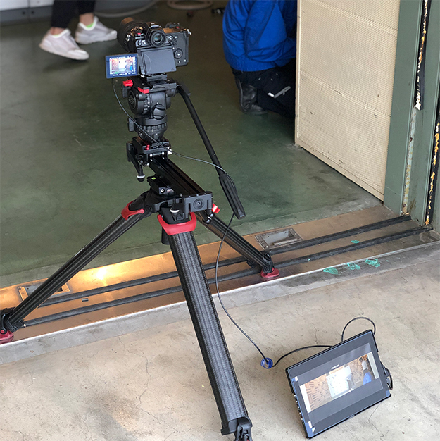 普通に考えれば、レールを敷いて移動するか、ドアウェイドリーのようなタイヤタイプの移動車でゆっくり移動させるところだろう。しかし条件は大変厳しく、三脚は一切NG、レールはおろか、台車も車椅子もNGと来た。そうなると選択肢は自ずとスティディーカムのようなジンバルか3軸の電動ジンバルになる。両方を組み合わせる、という話もあるのだが、残念ながら筆者は経験が無い。結局はDJI RONIN-SにS1Hを搭載して、極力水平移動を心がけ撮影してみましょう、という事になった。