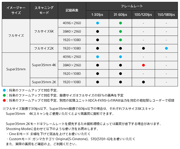時間の都合でハイフレームレートの検証は出来なかったが撮影できるバリエーションは以下の通り。