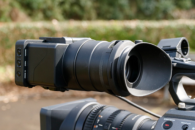 ビューファインダーもFS7 IIの960×540の解像度から1280×720のLCDパネルに一新されている。拡大フォーカス機能と併用する事でシビアなフォーカス確認を行うことができる。またアイピースもワンタッチ跳ね上げ方式に変更されている。