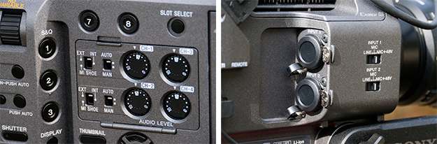 オーディオは4ch対応となっており、本体には2chのキャノン入力が装備されている。また拡張ユニット(XDCA-FX9)装着により、スロットイン ワイヤレスレシーバーからの音声を入力する事ができる。このカメラは意外と消費電力が高いようでBP-U60では1時間半程度がいいところのようだ。ちなみに付属のACアダプターは19.5V仕様となっている。オプション扱いの拡張ユニットはVマウントバッテリーに対応しており、12V4Pinキャノン端子が装備されている。BP-Uシリーズに不安を感じているなら是非購入をお薦めしたい。