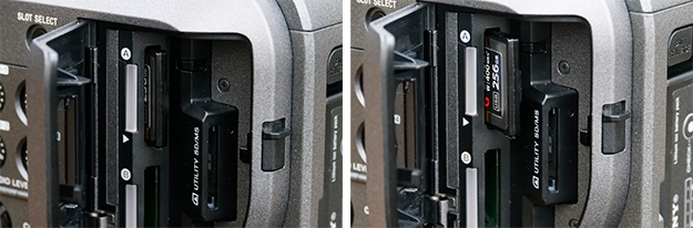 FX9を使用していて、実はXQDカードを抜く事が非常に難しいことが分かった。筆者の様な大柄な体格だと指が太い影響でXQDカードをつまみ出そうと思ってもUTILITY SD/MSスロットの出っ張りが邪魔をしてXQDカードがつまみ出せない事態になってしまった。XQDカードが抵抗なくスルっと抜けてくれればいいのだが、若干の抵抗があるため抜く事に難儀したのだ。最終的には人差し指を奥側に突っ込む形で抜くことが出来たのだが、この抜くときの体勢は、撮影中に咄嗟に行う事はなかなか難しいので上手くコツをつかむ必要がある。
