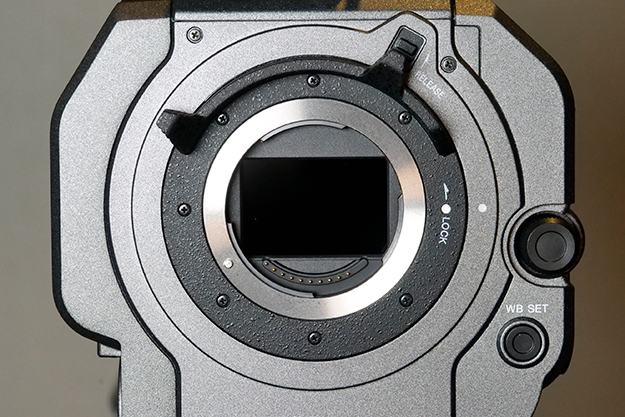本機の大きな特徴である6Kフルサイズセンサーは裏面照射型のCMOSセンサーとなっている。実際に写真でお分かりいただけるようにマウント部分ギリギリまでセンサーというサイズ感である。α7Sシリーズでも定評となっている方式だ。このセンサーよく見ると3:2の縦横比となっている。FX9は6Kフルサイズモードと4Kスーパー35モードを搭載している。6Kフルサイズモードでの撮影の際には、このセンサーから16:9または17:9を切り出すのでセンサー上下は使われていない事がお分かりいただけると思う。