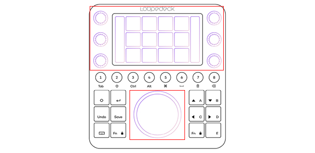 それぞれのワークスペースでページを変更するには、タッチボタンとホイールのタッチスクリーンは左右にスワイプ、ダイヤルはタッチボタンの外側にあるダイヤルの名前の部分を上下にスワイプする。