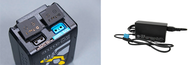 VL-DT1本体上部にはD-Tap端子を2つ装備。1か所あたり最大100W(16.8V~11V)までの容量があるため、外部モニターやレコーダーなど、十分給電可能な仕様となっている。写真を見ていただいてわかるとおり、2つあるD-Tapのうちの片方は水色の端子となっている(Advanced端子)。この端子は外部電源からの充電に対応しており、VL-DT1を使用する事により大型の充電器を持ち歩くのが困難な撮影現場などで簡易的な充電が可能となる。