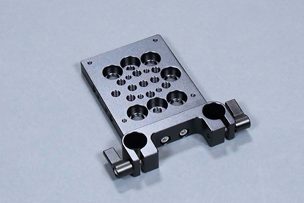 P-VmicroとA-CPmicro(Micro Cheese Plate)を組み合わせることにより、カメラサポートシステムの15mm標準ロッドに取り付け可能となる。Cheese PlateにはUNC 1/4が18か所UNC 3/8が5か所あるので、工夫次第で補器類を取り付け可能だ。