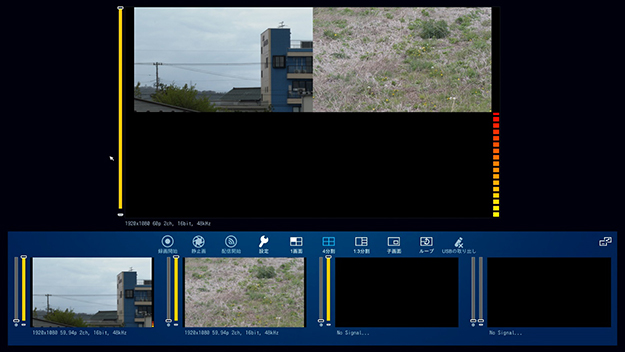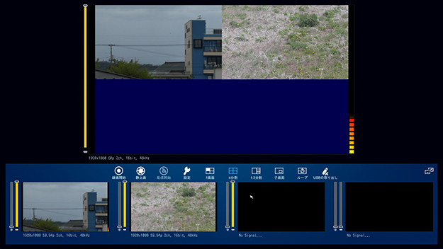 「4分割表示」をすると、下記のような形となる(試用時時は映像入力が2つのため、下半分は黒み)。