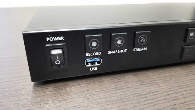 正面左側には、上列左から、電源スイッチ、録画の開始・停止操作を行う「RECORD」ボタン、スクリーンショット撮影を行う「SNAPSHOT」ボタン、ライブ配信を開始・停止の操作を行う「STREAM」ボタン、下列には、USBポートを1つ備える。