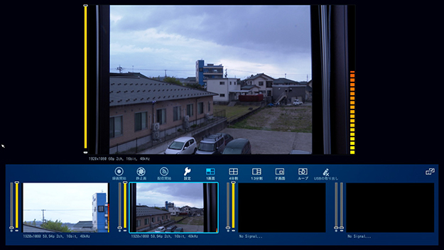 画面レイアウトは、シンプルなレイアウトに、主画面と入力ソース1~4の画面、音声出力のレベルを表示するレベルメータが配置されている。画面中央には、録画開始ボタンなど特に使うであろう機能のボタンが配列されている。
