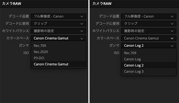 Canon RAWはCanon Cinema Gamut/Canon Log 2で認識されています。