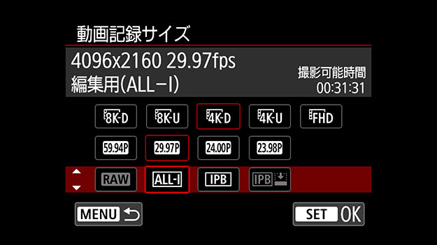 4K ALL-I→29:59(撮影持続時間の上限により終了)