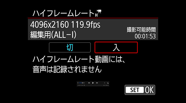 ハイフレームレートを選択した際は、一発で他の設定をキャンセルして4K標準のALL-Iに設定してくれます。