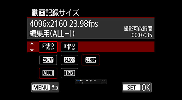 4K高画質に設定した場合は、動画記録サイズが4KDCIかUHDしか選択できなくなります。