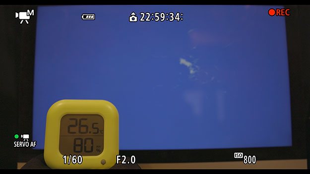 8K RAW、電源オンからスタートして、気温26℃の中、19:48録画後、「温度上昇のため電源がオフになります」と表示後に本体のスイッチはONの位置のまま、電源が落ちる。すぐに電源を入れ直し、動画モードを見ると、発熱マークと赤い0:00が表示される。そのままスチルモードにすると、普通に写真も撮れるし、H+の20枚/秒の写真も撮れている。バッテリー、カードを取り出して放熱すると、動画モードで赤い数字が白い数字に変わった。どうやら、自分のコンディションを見て、撮影可能の時間を表示しているらしい。メディアの残量ではなく、あくまでも録画稼働可能時間の様子。