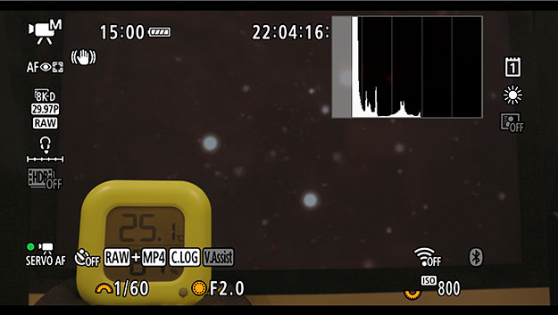 室温は26℃付近を維持。8K RAW+4K IPB同時振り分け記録を設定し、