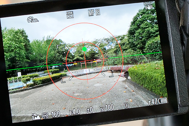 本機は上位機種同様のシャッター速度5段分の手ブレ補正を実現している。手持ち撮影時の手ブレ感知機能が非常に優れている印象だ。ちなみにギミックではあるが手振れ状態を視認確認できるモードが用意されている。中央に赤いターゲットマークが表示され、手ブレの様子が緑色の点で表示される。この点をなるべく揺らさないように丸いターゲット枠に収めておけばうまく補正された写真が撮れるという仕組みのようだ。