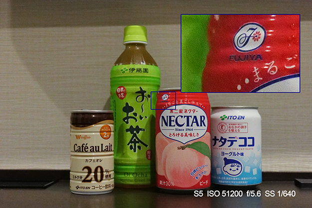 撮影時に確認した状態は同じS5に付属していたレンズのF値に合わせISO、F値、SSを設定した。ISOを51200で両機を比較した場合GH5SとS5とでは細かい部分の描写能力の差が出た(JPEGでの比較)。