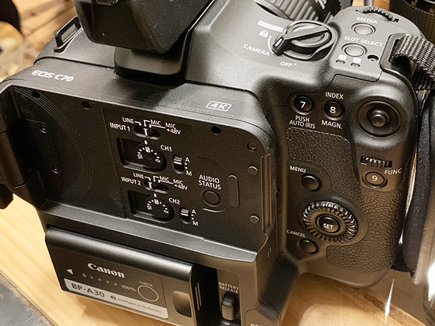 液晶モニターの裏には音響系の操作パネルが隠されています。こちらもキヤノンのカメラではお馴染みの操作系なので安心感があります。背面下部にはボディサイズからするとややアンバランスなバッテリーが鎮座しています。BP-A30がジャストサイズですが、さらに大きなBP-A60を取り付けるとかなり存在感が出てきます。本体の電力消費の少なさと相まってバッテリーの持ちは最高。BP-A60であれば、2本で朝から晩までほぼカバーできました。
