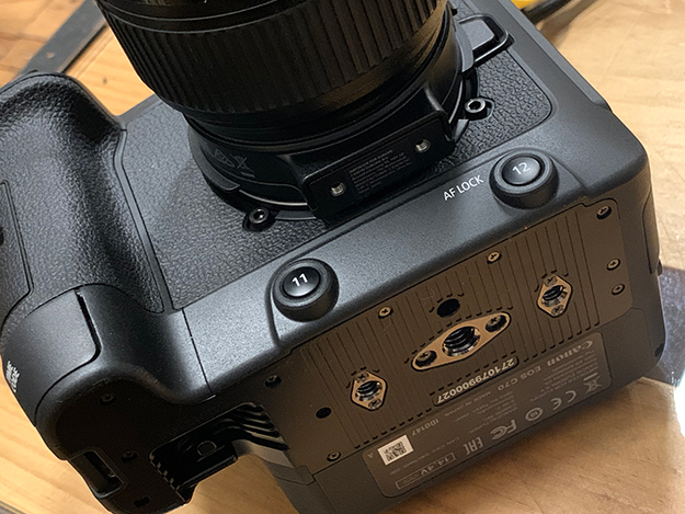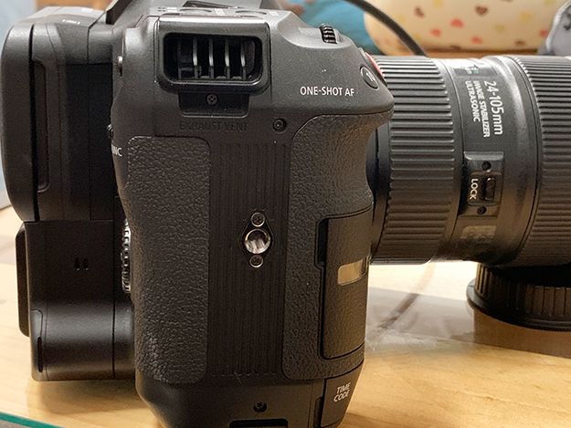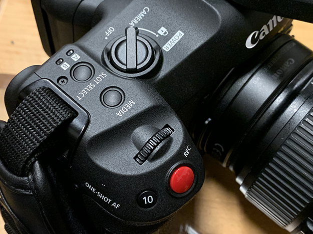 さて、最初にこのカメラを目にしたときの感想を素直に言えば「なんじゃこりゃ?」でした。今では慣れましたが、ずんぐりした他にない独特のフォルム。前から見た印象はEOS Rシリーズのミラーレスを思わせますが、そこからサイドを見て行くと、「長っ!」ちょうどミラーレスカメラの液晶部分を後ろに引き延ばしたようなスタイル。Rシリーズの面影をなんとなく感じながら、音まわり、冷却周りなど、動画に必要な要素をこれでもかと詰め込んだ形になっています。