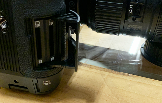 そこから前の方を見てみると意外な場所にメディアスロット。収録中にスロットの蓋を開けてカードを交換することも可能なので、長回しにも対応しています。その下にはタイムコード用のBNC端子。正直に言えばBNC端子は映像出力に使って欲しいところでした。タイムコードは小型のカメラでは音声入力端子で代用したりすることもあるので。専用端子は確かにありがたいですけどね。
