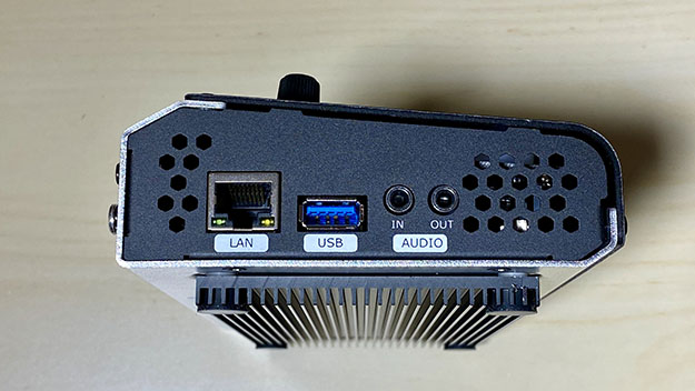 PCと接続し本機をリモートコントロールしたり、ファームウエアアップデートなどに必要なLAN端子、PCで本機をビデオキャプチャー機器として利用するためのUSB 3.0、ミキサーなど外部からの音声を利用する際、AUDIO IN、スピーカーやヘッドホンに音声を出力する場合はAUDIO OUTを利用する。それぞれの端子は3.5mmステレオミニジャックだ。
