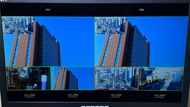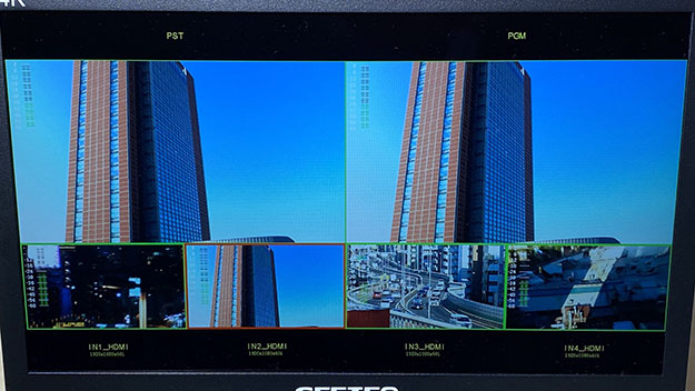 HDMI OUTを外部ディスプレイに接続し「OUTPUT」で「PREVIEW」を選択すると表示されるマルチビュー画面だ。上部左からPST(プリセット)、PGM(プログラム)IN1_HDMI IN2_HDMI IN3_HDMI IN4_HDMIの内容が表示される。PinPによる子画面の内容や位置もマルチビューの画面上で確認することができる。また、それぞれの入力ソースの下には接続された映像機器の解像度、走査方式、フレームレートが表示される。