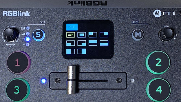 「S」ボタンで「PinP」の設定を呼び出し「PUSH」ノブを使って目的のプリセット・パターンを選択する。ただし、PinPのサイズや位置は変更することができず、あらかじめ用意された9種類のプリセット・パターンの中から選択するのみとなる。