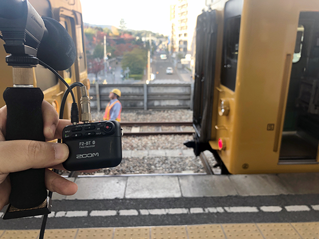 付属のラベリアマイクだけでなく、電池駆動のショットガンマイクやプラグインパワー対応のマイクが使える。写真はゼンハイザーMKE600。鉄道の連結器が出す大きな金属音も割れることなく簡単に高音質で録音できた