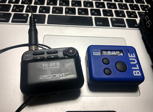 Ultra Sync BLUEを使うと、Bluetooth接続でスマホやZOOM F6、F8nなどと完全な同期が可能になる(タイムコード同期)。F2とF6のタイムコード同期実験では、波形までピタリと一致した。F2の場合、一度ペアリングしてしまえば、あとは電源を入れるだけでシンクロする。仕込みマイクに使う場合、安価なBluetoothの音声送受信機(セットで五千円程度)で衣擦れさえ監視していれば、あとはF2を録音しっぱなしでOK。ボリューム調整不要であることは、映画の撮影を大きく変えるかもしれない