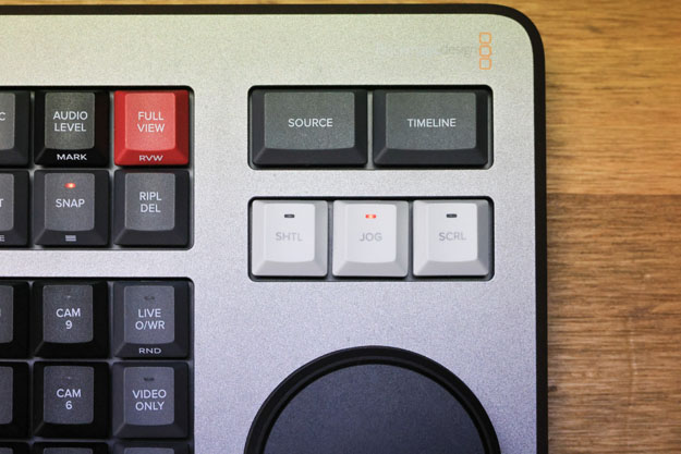 「CAM1~9」と「LIVE O/W」:「同期ビンで同期されたマルチカム編集で使用する。「CAM1~9」の数字を押したままホイールを回転させると最上位のトラックにクリップが追加される。「LIVE O/W」がオンになった状態で「CAM1~9」を押すとカメラを切り替えるようにクリップが配置される。