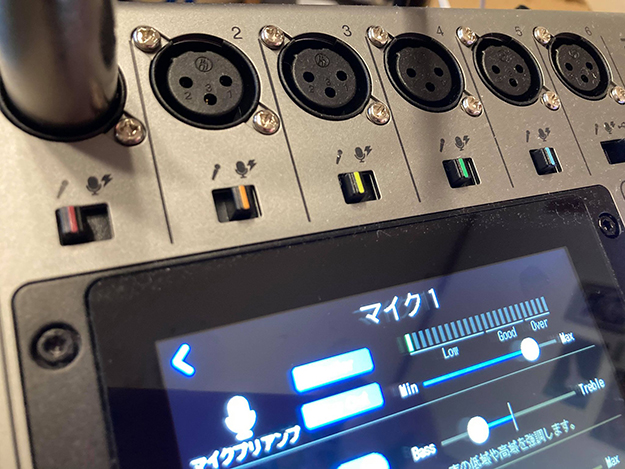 コンパクトな本体には必要最小限の物理スイッチがあり細かな設定はタッチスクリーンで行う。XLR入力の物理キーはマイクのファンタム電源のオンオフとミュート、オンエアーキーとフェーダーのみ。ファンタム電源のオンオフが全チャンネル個別に切り替えられるのでダイナミックマイクとコンデンサーマイクは柔軟に組合わせ可能なのがうれしい。