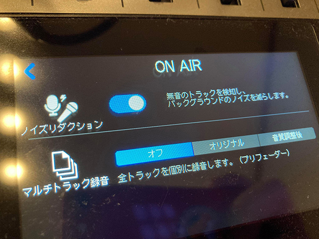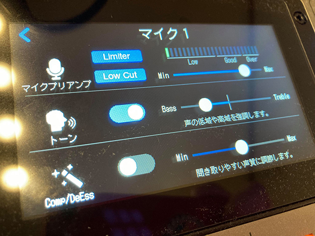 各チャンネルの設定は4つの項目のみのシンプル設計。マイクプリアンプの項目でゲインとリミッター、ローカットのオンオフを設定。どちらもオンオフ以上の細かなパラメーターの設定はない。EQにあたるのはトーンの調整で、これも低音と高音のスライダーを左右に動かすだけ。左に動かせば低域強調、右に動かせば高域強調、つまみが真ん中だとなぜか低域と高域を少し強調するという仕様。このあたりは慣れが必要だが男性ゲストのマイクは少し左へ、女性ゲストのマイクは少し右へくらいの調整が出来ると考えておけばいいだろう。