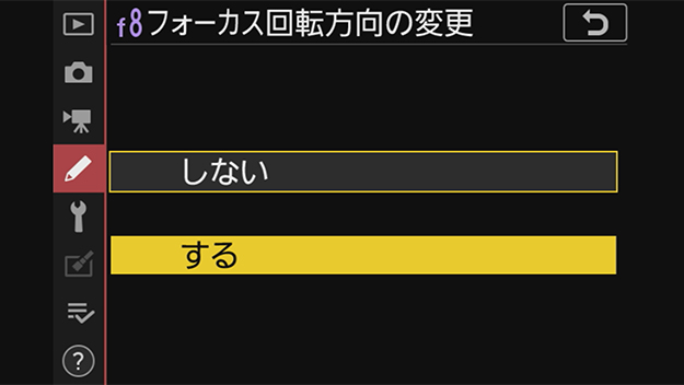 [カスタムメニュー f8]→[フォーカス回転方向の変更]→[する/しない]