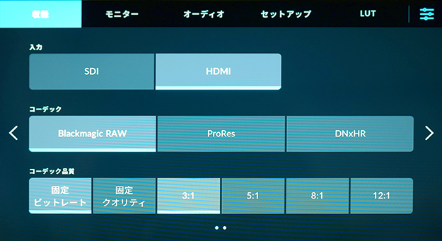次に、BMVA12G側の設定だ。[収録]の[入力]を[HDMI]に。[コーデック]を[Blackmagic RAW]に。[コーデック品質]は収録の内容に応じて、適宜設定する。カメラ側と連動動作させるために、[トリガー収録]を[ビデオ開始/停止]に設定。カメラのHDMIからのタイムコードを記録する場合は[セットアップ]の[タイムコード入力]を[ビデオ入力]とする。