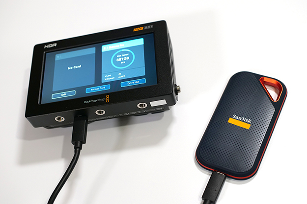 最後に、サンディスク エクストリーム プロ ポータブルSSDのフォーマットも忘れずに行っておこう。1TBの容量の場合、3840×2160 29.97p – BRAW固定ビットレート3:1でおよそ130分の収録が可能だ。