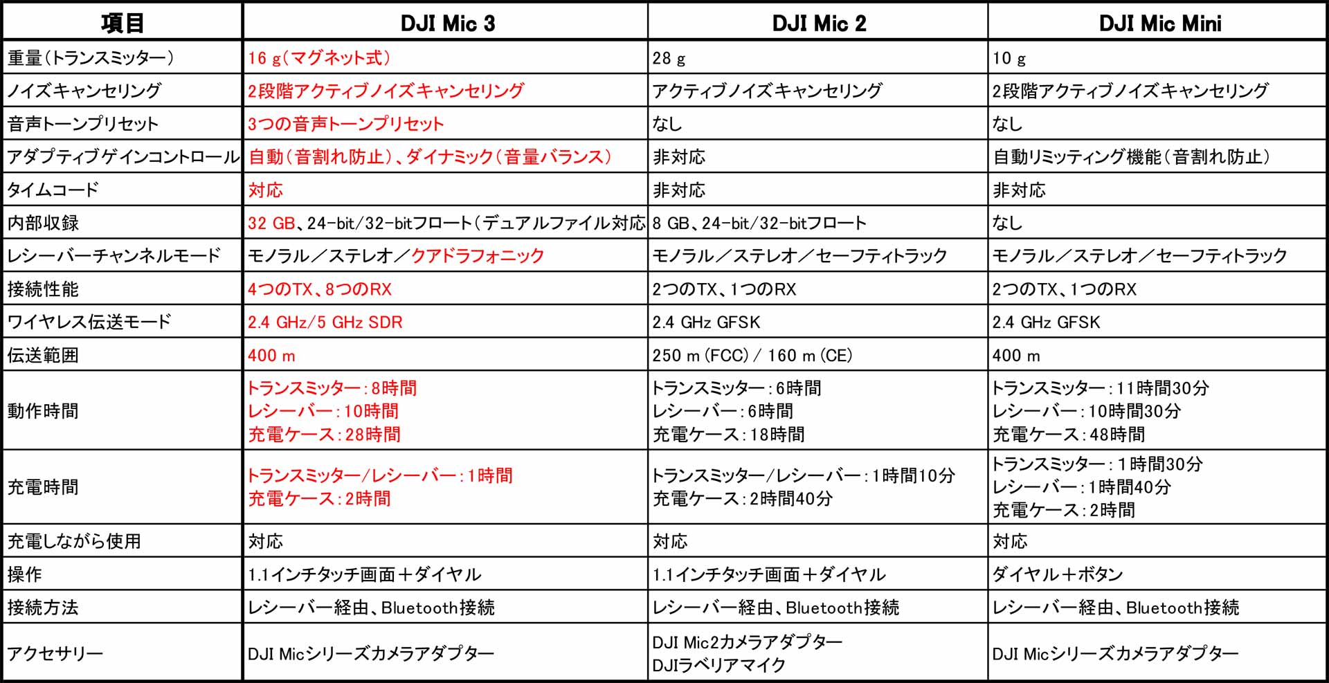この違いを含む音声比較の動画を制作しました。DJI Mic 3、Mic 2、S社の汎用的なB帯マイクとの比較もしました。