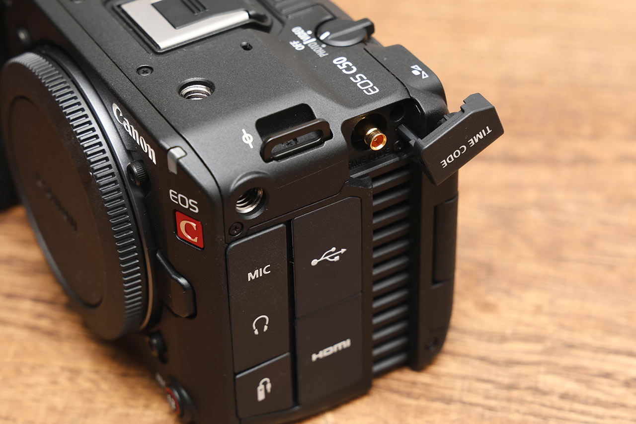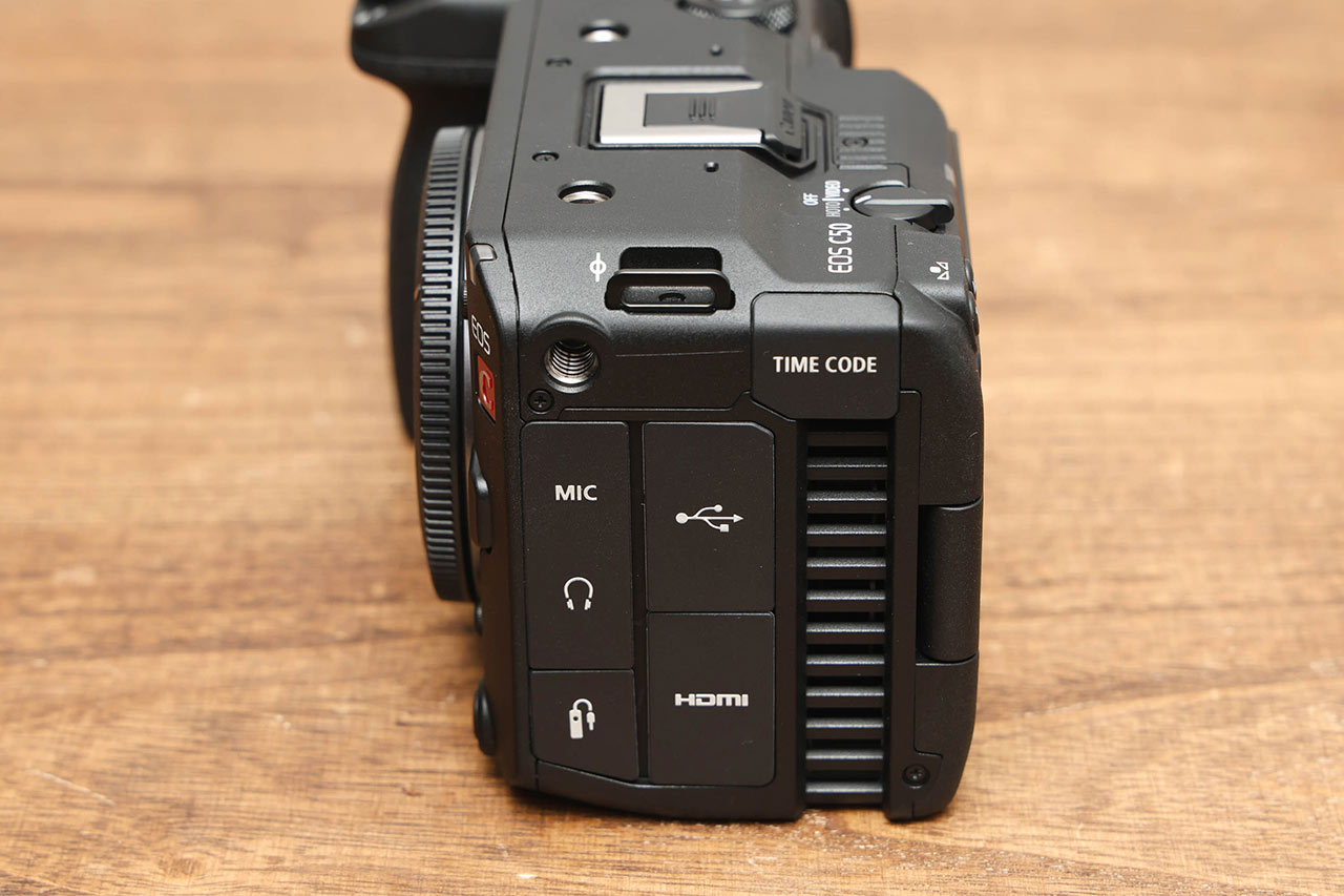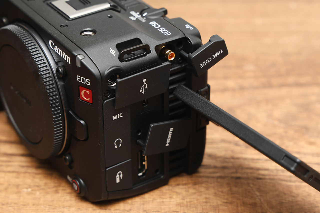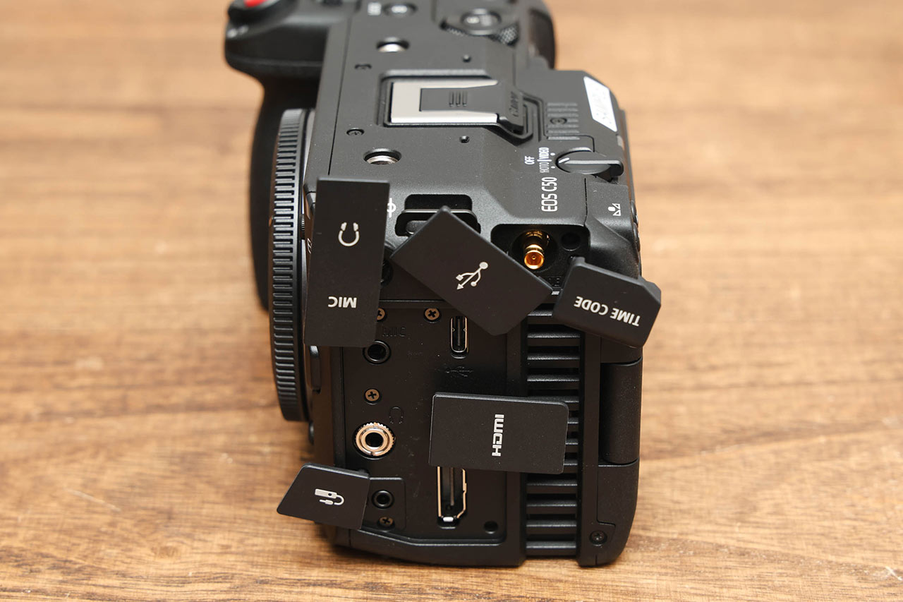 インターフェースはシンプルながら堅実な作りという印象だ。ケーブルがバリアングルモニターに干渉することはなく、HDMIももちろんType-Aを採用している。タイムコード端子はDIN規格で、EOS R5 CやC400と同一形状。EOS C80、C70、XF605に対しては変換が必要となる。