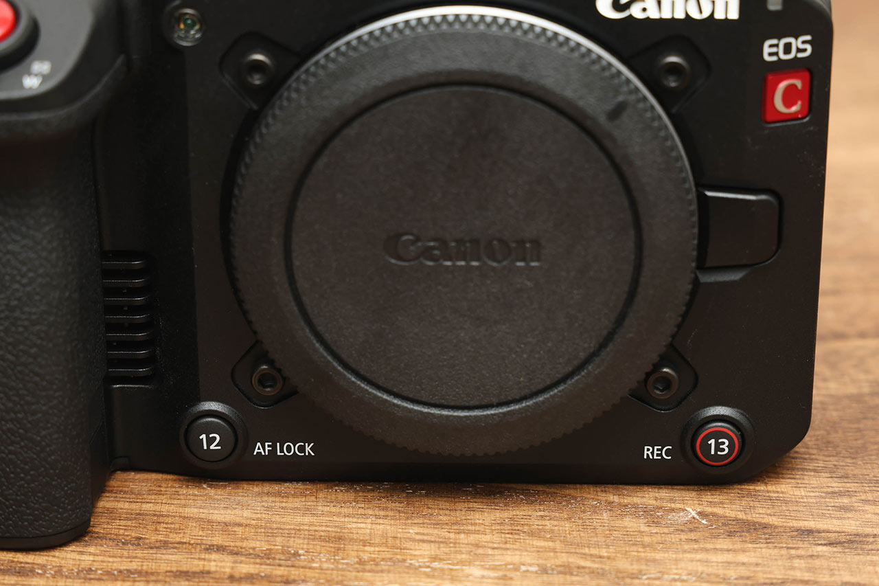 ボディ前面下部にも、独立したアサイン可能な「REC(13)」ボタンが配置されている。ボタン配置からも分かる通り、EOS史上類を見ないCINEMA EOS寄りのハイブリッドモデルと言えよう。