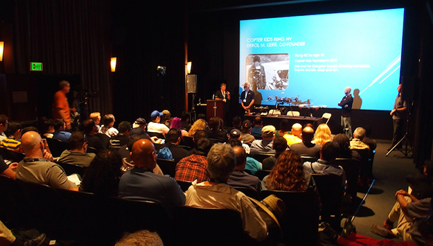 Technologies and Techniques for Remote Aerial Imagingのセッション風景。セミナー形式のイベントの中でも最も人気があった模様。会場は熱気に包まれ、立ち見で受講する人々も多くみられた