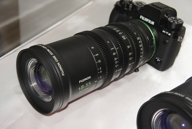参考出展のスーパー35対応フジノンシネマ用ズームレンズMK18-55mm T2.9。本体重量は約980gと軽量ボディとなっている
