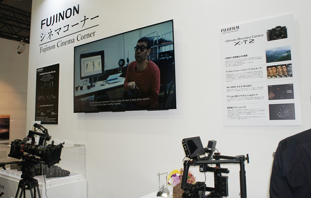 デジタルシネマコーナーでは同社のデジタル一眼レフカメラX-T2による動画撮影システムや参考出展のXマウントデジタルシネマ用レンズ2本および開発中のレンズが出展された