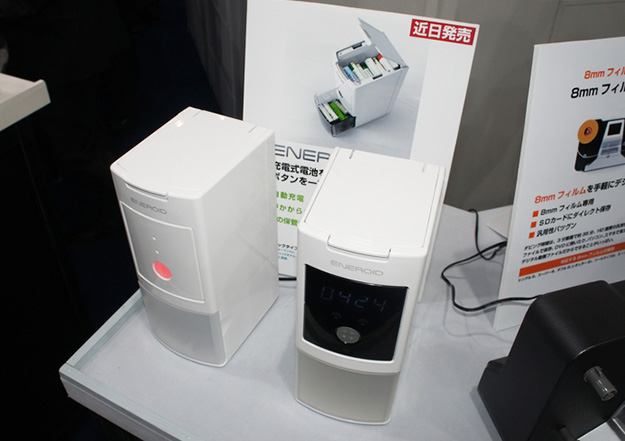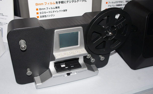8mmフィルムスキャナー。3分の8mmフィルムを約35分でMP4フォーマットのHD画質でキャプチャー可能。記録メディアはSDメモリーで、シングル8、スーパー8、レギュラー8の3-5号リールに対応